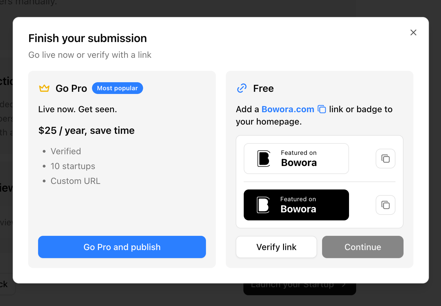 Invite 5 founders who launch their startup on Bowora, and you’ll get a code for one year of free Pro.
